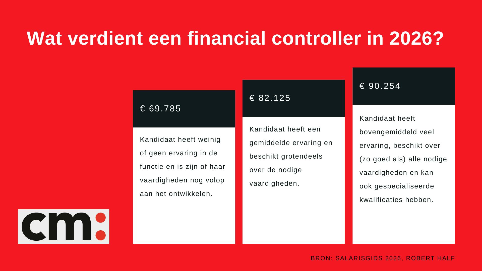Volgens de nieuwe Salarisgids van wervingsbureau Robert Half ligt het gemiddelde bruto jaarsalaris van een medior financial controller in 2026 op € 82.125. De infographic hieronder laat het onderscheid zien tussen 3 groepen op basis van kennis en ervaring: